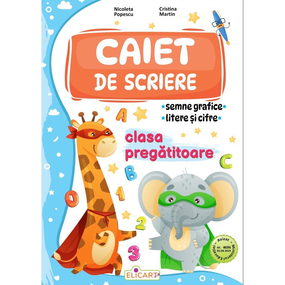 Avizat M.E.N. prin Ordinul nr. 4696 din 02.08.2019 Deprinderea de a scrie poate fi un proces anevoios, care necesita rabdare si staruinta din partea celor mai mici scolari. Astfel, Caietul de scriere ofera exercitii de dezvoltarea musculaturii fine, fiind structurat progresiv, de la cele mai simple semne grafice, pana la literele si cifrele mai complexe. Pentru a capta atentia micutilor si a le stimula imaginatia, am introdus rubrica Fii creativ!, care contine activitati haioase si istete, din care elevul va descoperi ca invatatul poate deveni o simpla joaca. Asadar, Caietul de scriere ar trebui sa devina un instrument nelipsit din ghiozdanul elevilor de clasa pregatitoare.