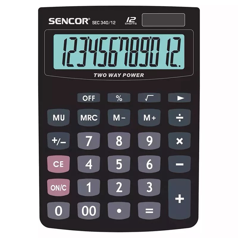 Calculator birou SENCOR S-SEC340/12. Afisaj cu 12 cifre Calcule fiscale Procent Memorie cu 4 taste Butoane din plastic Alimentare dubla solară/baterie Dimensiuni: 143 x 102 x 29 mm.