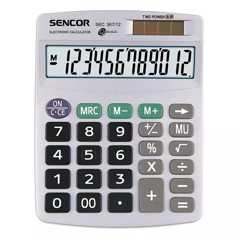 Calculator birou SENCOR S-SEC367/12. Afisaj cu 12 cifre Tasta de corectare Tasta procentuală și rădăcină pătrată Memorie cu 3 taste Alimentare dubla solară/baterie Oprire automată Dimensiuni: 152 x 120 x 39 mm.
