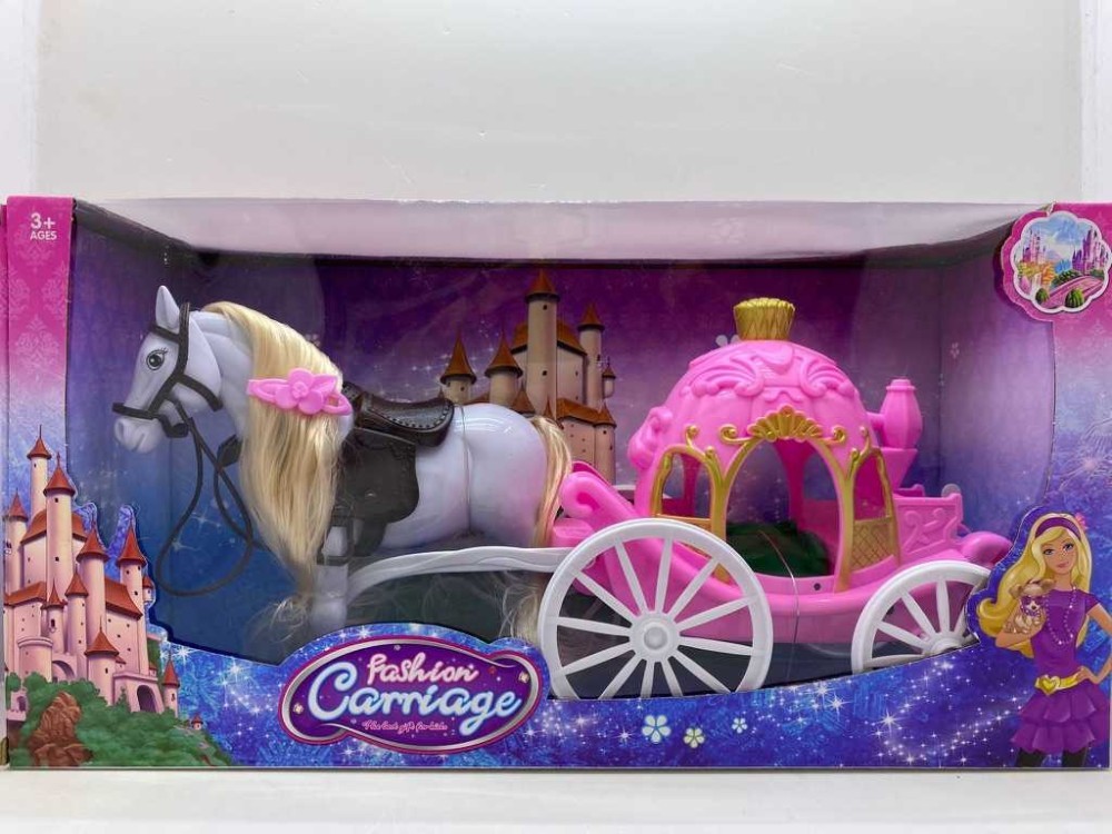 Caleasca cu cal de jucarie. Fiecare papusa va dori sa mearga in aceasta caleasca minunata la balul de vis! Material plastic. Nu necesita baterii. Dimensiune cutie 37x20cm. Este recomandat copiilor peste 3 ani.
