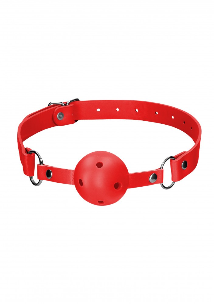 Calus prevazut cu bila perforata. Dispune de curea care se regleaza cu usurinta datorita cataramei metalice. Bila este realizata din ABS, iar curelusele sunt din piele sintetica. Elementele metalice completeaza designul bondage. Alte detalii: material poliuretan + ABS. | Material: Poliuretan | Diametru: 4.5 cm | Culoare: Rosu