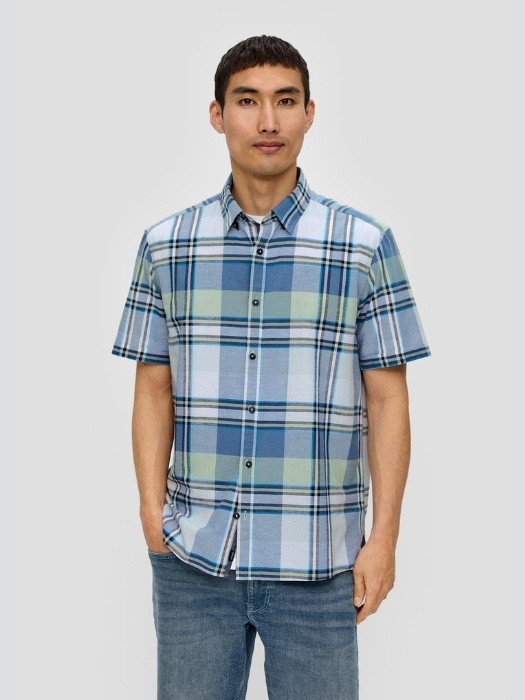 Camasa barbati cu maneca scurta din amestec de in si bumbac, imprimeu in carouri, croiala Regular fit, Albastru, S