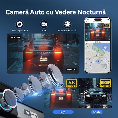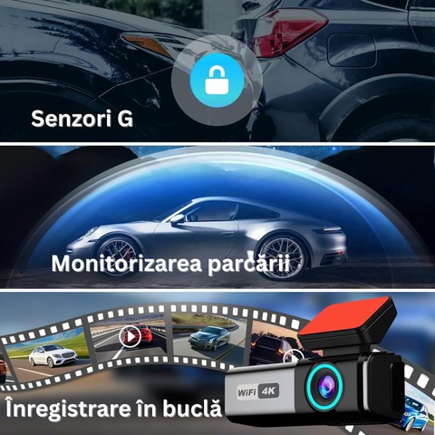 Camera Auto de Bord 4K Full HD, WiFi, Unghi 170°, Vedere Nocturna, G-Sensor, Inregistrare Bucla, Monitorizare Parcare, Card 64GB Inclus, Negru