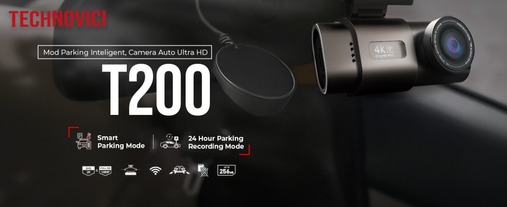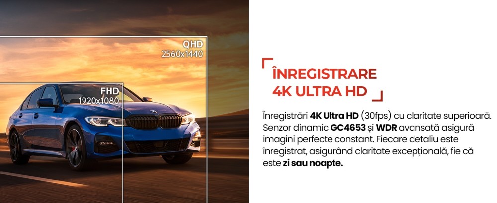Camera auto DVR cu doua camere ofera inregistrare video 4K Ultra HD (3840x2160p) pentru camera frontala si Full HD 1080p pentru camera spate. Sistemul asigura imagini clare zi si noapte prin senzor CMOS de 12 megapixeli cu tehnologie WDR. Este un instrument util pentru documentarea in trafic, protectie la accidente si supraveghere parcare.