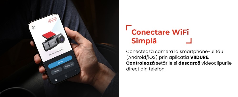 Aplicatia gratuita Viidure este disponibila pe Google Play (Android) si App Store (iOS). Conectarea la camera auto se face prin WiFi direct, fara a consuma date mobile.
