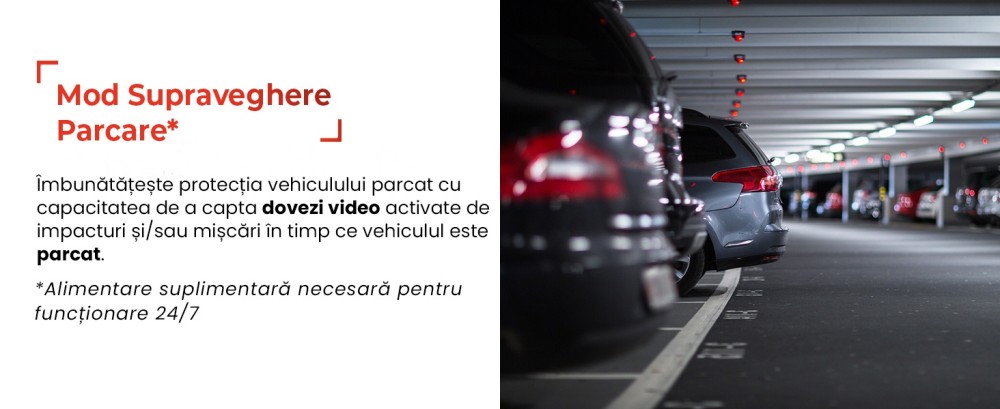 Cand masina este oprita, camera intra in modul de supraveghere. Aceasta monitorizeaza constant prin senzori de miscare si G-Sensor. Daca detecteaza o lovitura sau miscare in fata camerei, porneste imediat inregistrarea si salveaza clipul intr-un folder special protejat.