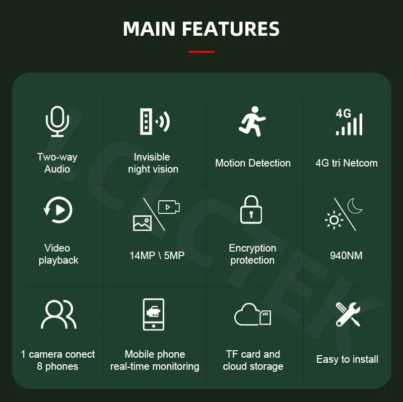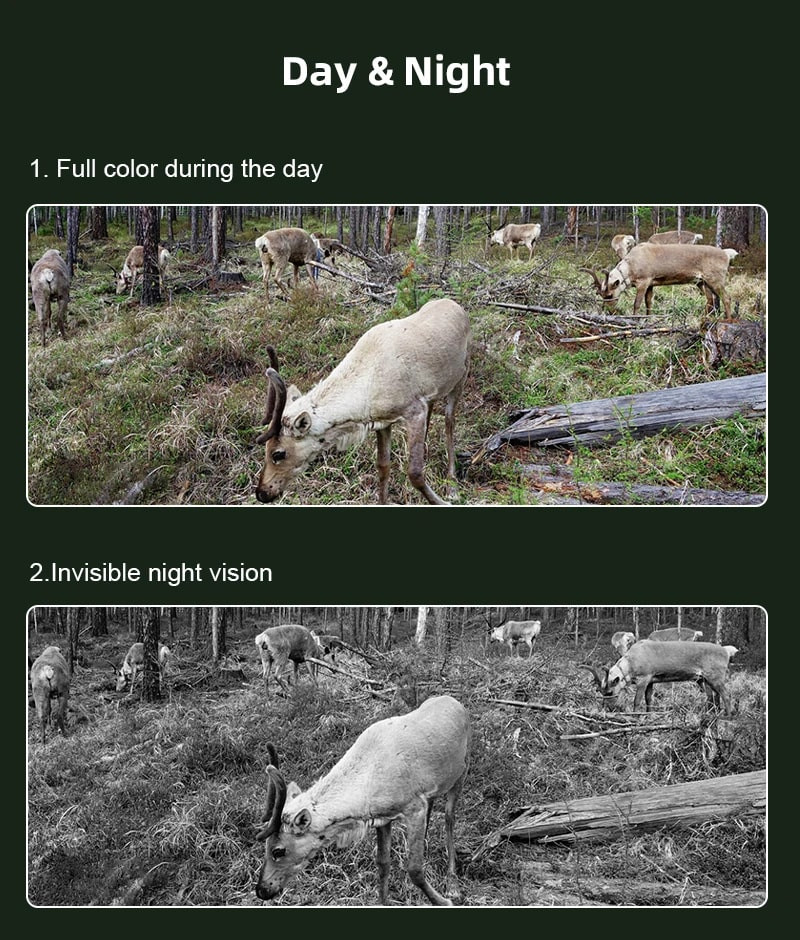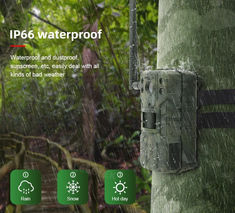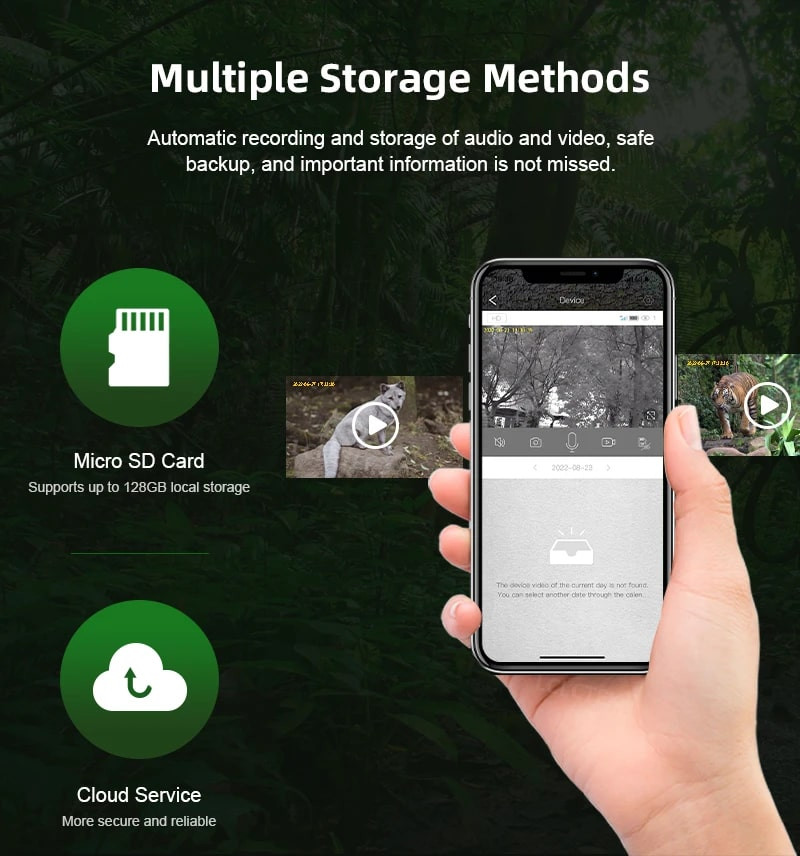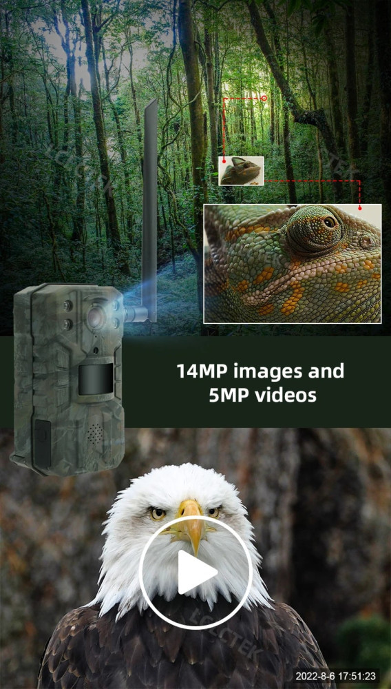 Alimentat de transmisia de date 4G LTE pentru a furniza imagini ale camerei de pe teren direct pe telefonul inteligent, tabletă și computer. Odată ce camera se declanșează, imaginile sau videoclipurile sunt trimise direct către aplicația mobilă, indiferent când și unde vă aflați. Doar introduceți cartela SIM și puteți viziona videoclipuri în direct de la distanță pe telefonul mobil sau computer.