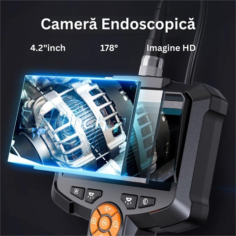 🔍 Cameră Endoscopică de Inspecție 1080P HD, Ecran 4.2”, Cablu 5M, 8 LED-uri, Zoom Reglabil, IP67, Baterie 2000mAh, Accesorii Incluse, Negru
