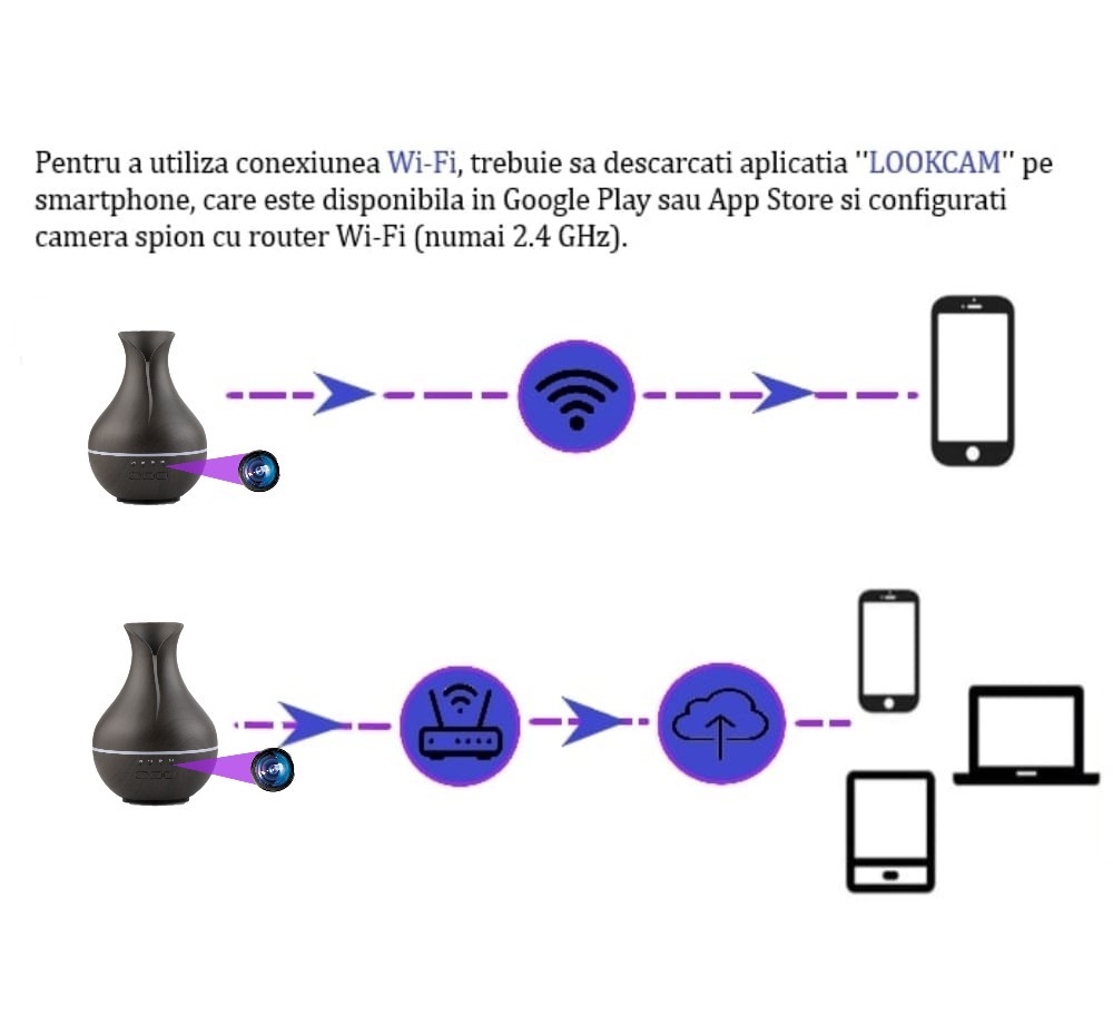 Camera spion cu tehnologie Wi-Fi IP P2P vă permite să vizualizați ce se filmează direct de pe telefon, tabletă sau computer. Dacă vă aflați la o distanță de 5-10 de metri de micro cameră sau dacă în respectiva locație există internet wireless, puteți conecta minicamera direct la router și va rezulta o cameră video IP wireless mascată ce vă permite monitorizarea de oriunde din lume.