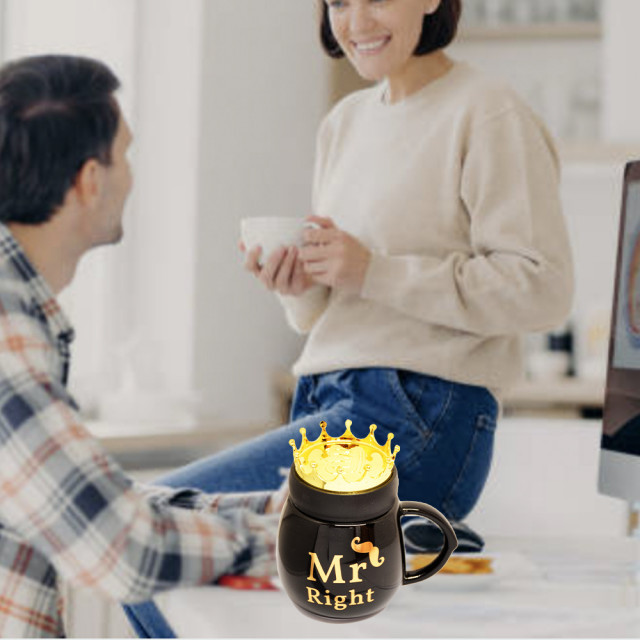 Cana cu capac din ceramica Pufo Mr Right, pentru cafea sau ceai, 500 ml, negru