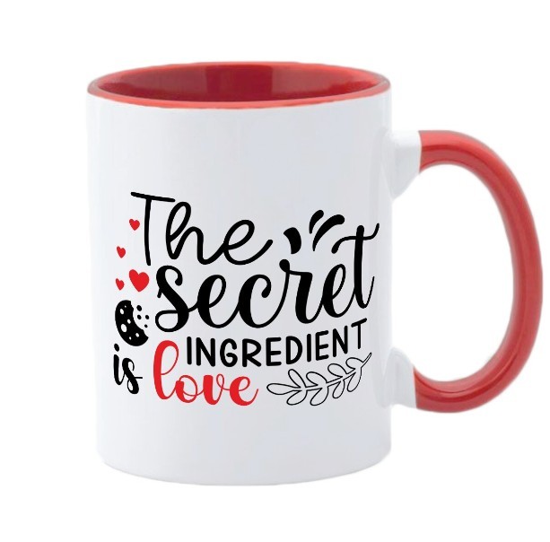 Cana maner rosu personalizata The secret ingredient is love, INOVATIX®. 330ml