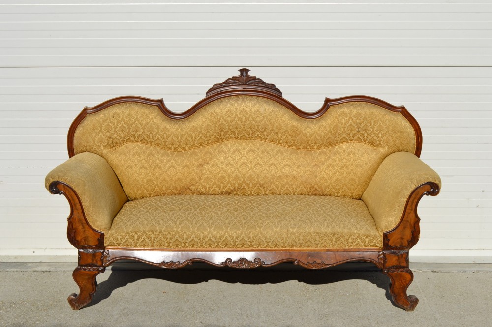 Canapea in stil Biedermeier, din lemn cu furnir de mahon, spatar curbat, perioada 1860.