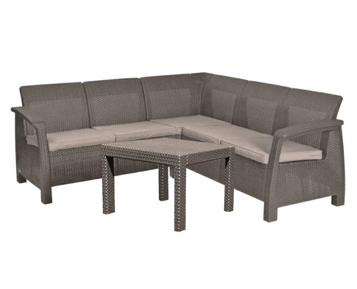 Setul practic de mobilier de grădină din plastic este o combinație din mai multe piese de mobilier. O canapea de colț spațioasă are spătare frumos conturate și cotiere confortabile. Setul include o măsuță de cafea practică unde puteți lua cina în aer liber cu familia. Canapeaua de colț este dotată cu perne confortabile, cu huse de pernă cu fermoar, astfel încât husele de pernă pot fi spălate cu ușurință. În plus, o caracteristică practică a setului de grădină cu masă este că brațele sunt la o înălțime care permite amplasarea fotoliilor sub masă, ceea ce economisește spațiu.