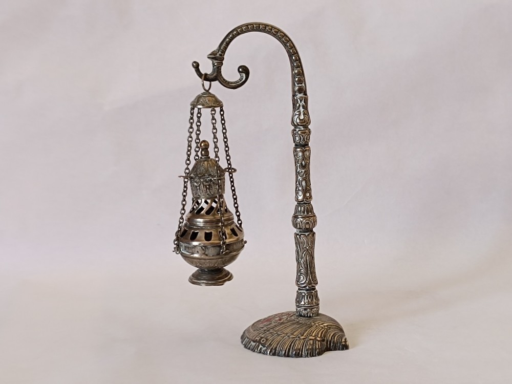 facuta din metal alb, probabil argint sau argintata, ornamentata cu