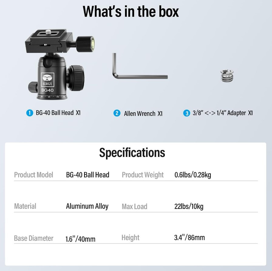 Proiectat cu un surub cu filet de 1/4" si un filet inferior de 3/8", Sirui Ballhead BG40 vine cu un adaptor pentru suruburi de 1/4" la 3/8", ceea ce il face potrivit pentru majoritatea DSLR-urilor. camere, camere video, trepiede, glisoare, monopiede.