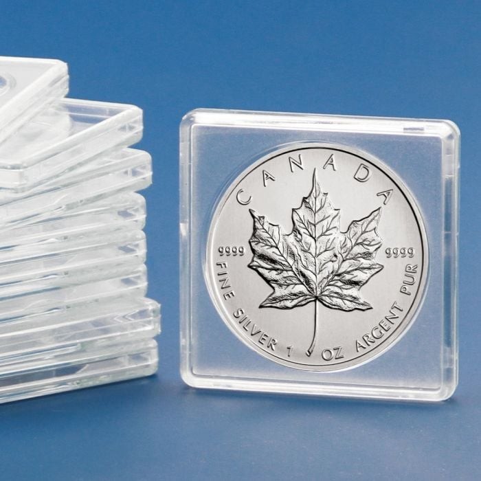 Capsule patrate pentru monede cu diametrul de pana la 32,5 mm. Capsulele au la exterior o dimensiune de 50 x 50 mm. Locasul pentru monede este rotund. Cutie de 10 bucati.