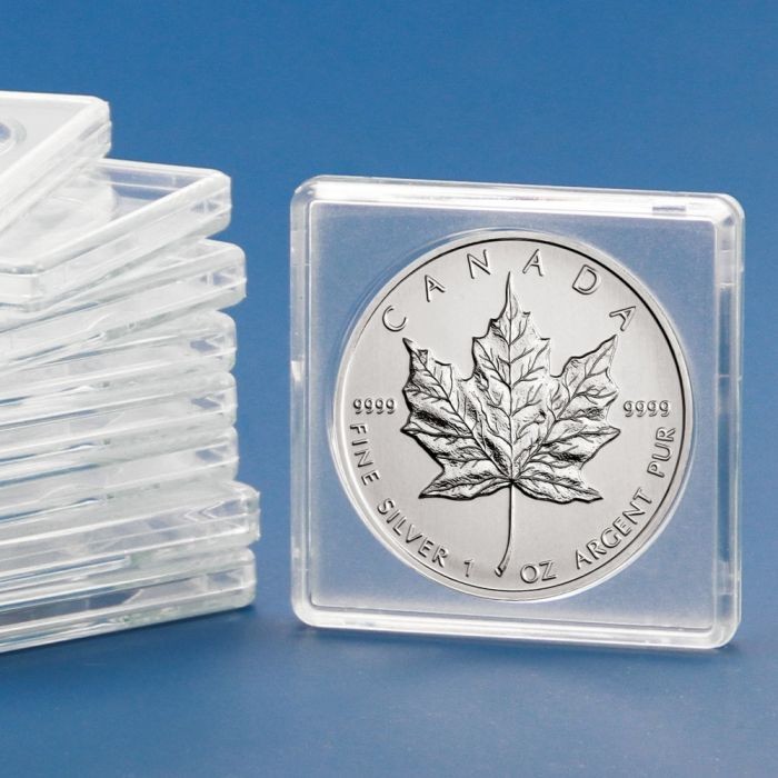 Capsule patrate pentru monede cu diametrul de pana la 32 mm. Capsulele au la exterior o dimensiune de 50 x 50 mm. Locasul pentru monede este rotund. Cutie de 10 bucati.