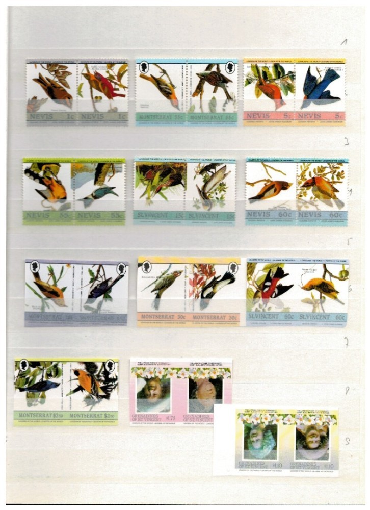 Lotul din cele 5 imagini, conține emisiuni din Nevis, Montserrat, Grenadines of St. Vincent, Union Island, St. Vincent - toate cu eroare: centrul ranversat. Erorile sunt menționate intr-o nota de subsol intr-o ediție speciala a catalogului Michel (un extras este livrat impreuna cu acest lot) si sunt foarte bine cotate, dar din păcate NU putem garanta ca este vorba de erori autentice!