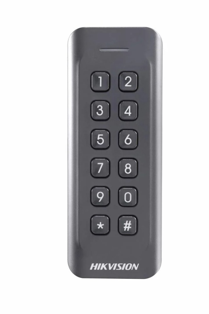 Card reader Hikvision, DS-K1802EK; Reads EM card, with keypad; Card Reading Frequency: 125KHz; Processor: 32-bit; Reading Range: ≤50mm (≤ 1.97"); Supports Wiegand(W27/W35) protocol, Dust-proof, IP 65.