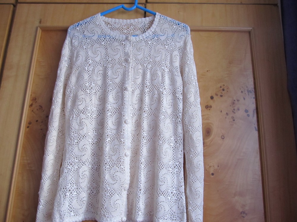 Cardiganul este crosetat, pe culoare crem, din fir de bumbac cu matase, foarte frumos, purtat foarte putin timp.