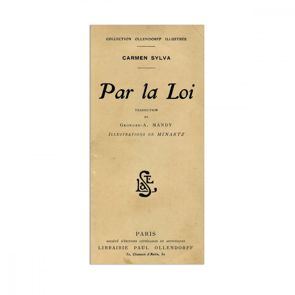 Carmen Sylva, Par la Loi, Paris, Librairie Paul Ollendorff, 1899, 181 p. Tradus de Georges A. Mandy. Cu ilustrații de Minartz. Legătură contemporană cu cotor și colțuri din piele, iar în interior se păstrează coperta originală.