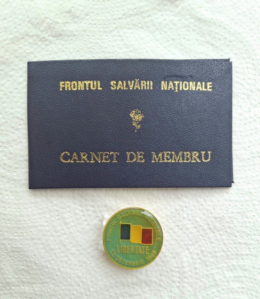 Carnet de membru si insigna ale Frontului Salvarii Nationale, formatiune politica aparuta imediat dupa caderea regimului comunist. Insigna are diametrul de 3 cm si se afla in stare buna, cu aspect bine pastrat.