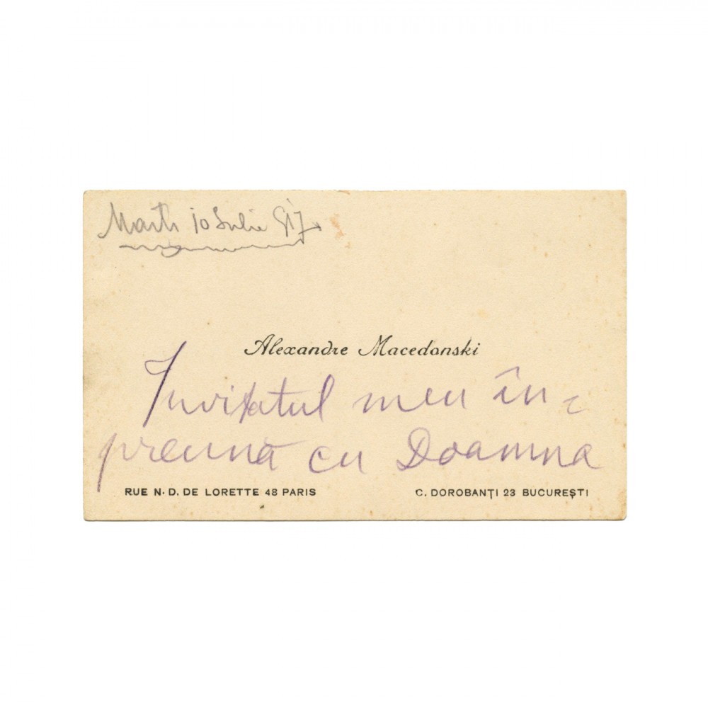 Cartea de vizită a poetului Alexandru Macedonski, cu un scurt text olograf, datat 1917. Prin această carte de vizită, poetul face o invitație la una din piesele sale de teatru sculptorului Frederic Storck și soției acestuia, Cecilia Cuțescu Storck.