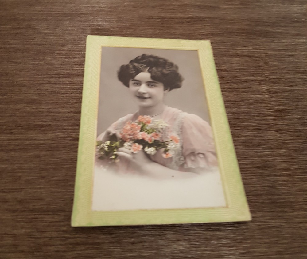 Fotografiile fac parte din descriere . Carte poștală vintage: Portret feminin elegant cu flori – Franța, circulată cu timbru original