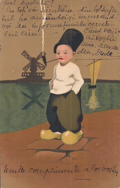 Cartea postala prezinta o caricatura cu un baietel olandez care fumeaza pipa