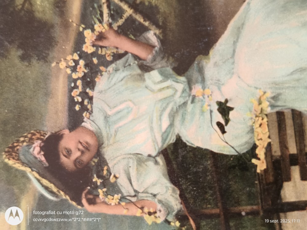 carte postala deosebita , interesanta ,Tanara in rochie alba , cu flori .