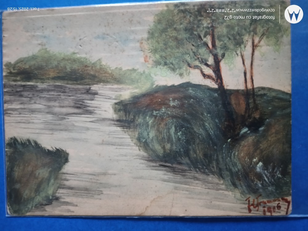 carte postala executata manual de pictorul Frumusanu , in anul 1906 , pictura pe foaie subtire de lemn , lucrare unicat , exceptionala