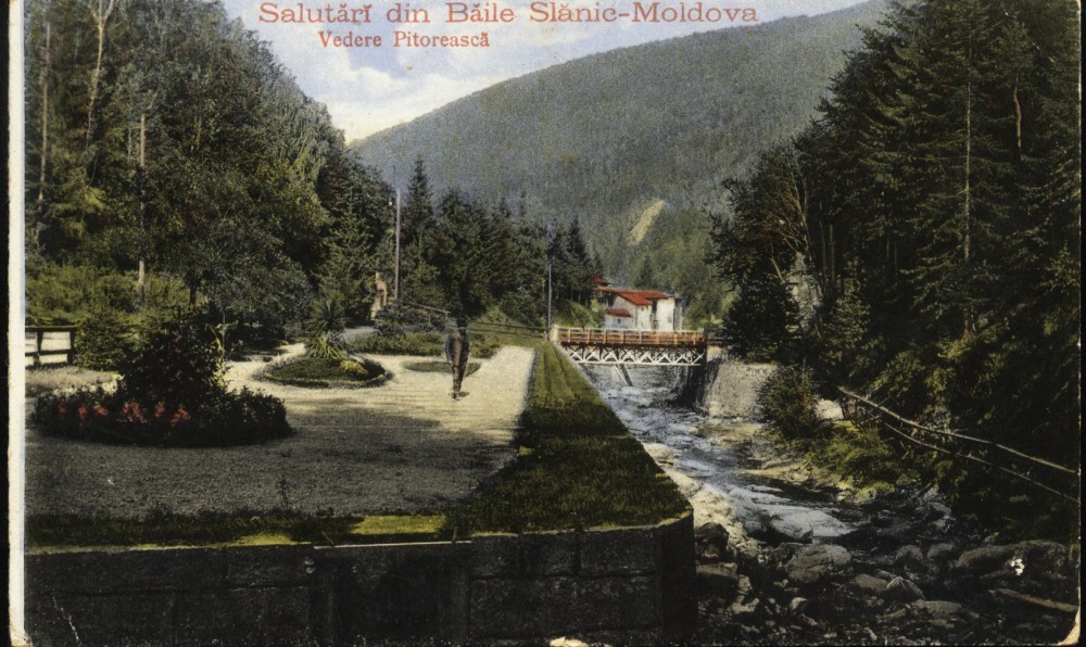 Carte postala ilustrata salutari din baile Slanic Moldova, vedere pitoreasca. Editura librariei Patron Tecuci . Necirculata. Stare conform foto.