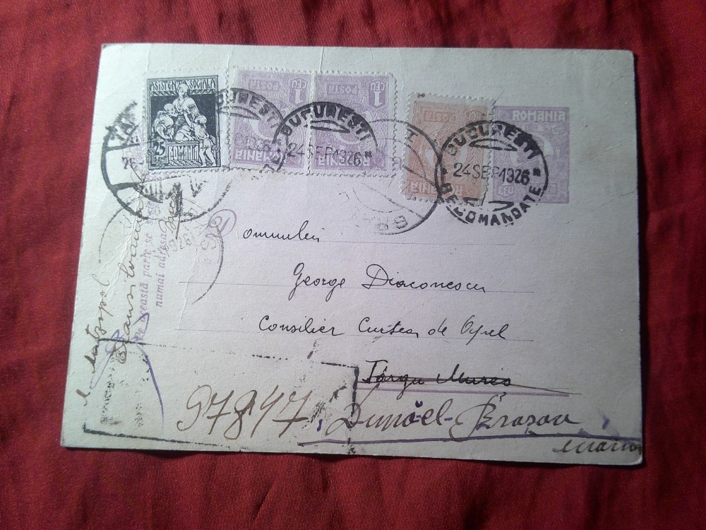 Carte Postala Recomandata circulat 1926 Targu Mures -redirectionata Brasov - Bucuresti