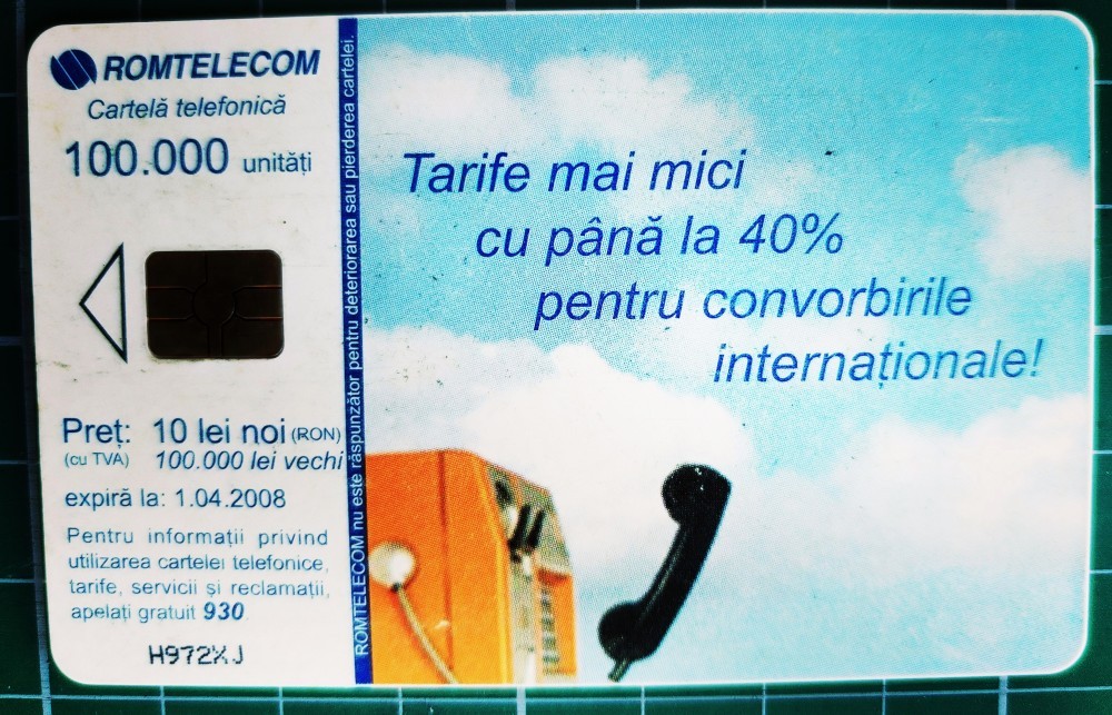 Cartela telefonica Romtelecom 10 lei noi 100.000 lei vechi Tarife mai mici H972XJ 100.000 unitati exp. 01.04.2008 In contact cu lumea prin ROMTELECOM