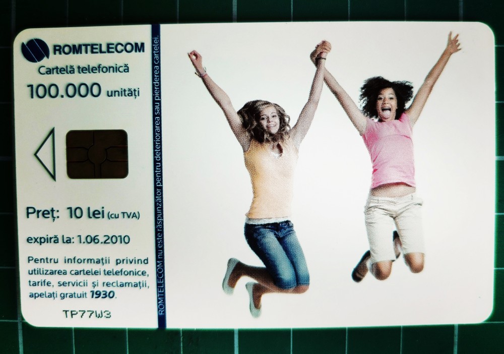 Cartela telefonica Romtelecom 10 lei Vorbeste cand vrei, cu cine vrei TPT7W3 100.000 unitati expira 01.06.2010 Bule albastre doua fete in saritura