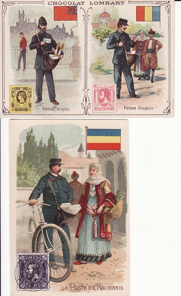 2 cartoane publicitare Lombart-Posta in Romania ,dimensiuni 7x10 ,tip cromolito.