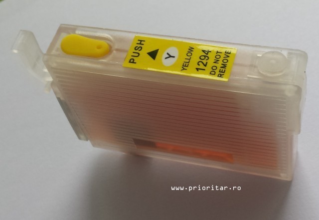 IMPORTANT: Aceste cartuse autoresetabile sunt PLINE CU CERNEALA, nu au burete si au incorporat un cip auto resetabil. Gasiti pe stoc la noi si cerneala speciala pentru aceste tipuri de cartuse. Reincarcarea cartuselor refilabile, autoresetabile T-1291 T-1292 T-1293 T-1294 Epson se face prin indepartarea dopului colorat de cauciuc si introducerea cernelei in orificiul respectiv al cartusului. Dupa reincarcarea cartusului Epson autoresetabil T-1291 T-1292 T-1293 T-1294 se inchide orificiul cu dopul corespunzator si se scoate dopul alb de aerisire.