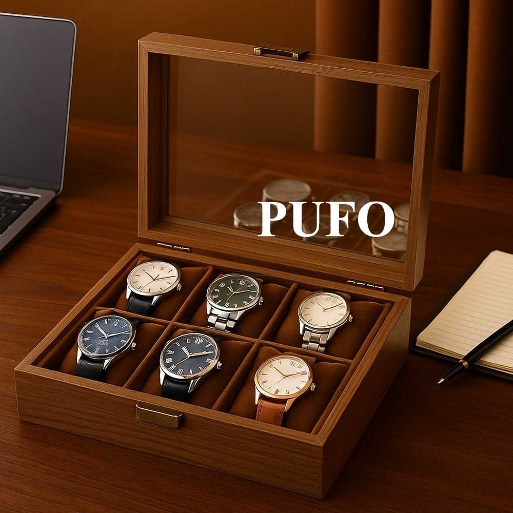 Caseta eleganta din lemn pentru depozitare si organizare 6 ceasuri, model Pufo Noble, maro