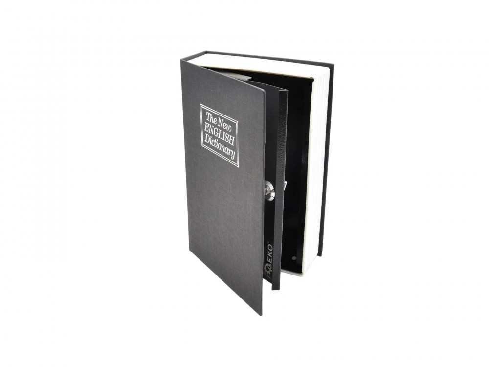 O caseta sub forma de carte.. Un compartiment metalic în interior. Doua chei incluse.. Dimensiuni externe: 180 x 115 x 55 mm.. Dimensiuni caseta: 165 x 115 x 49 mm.