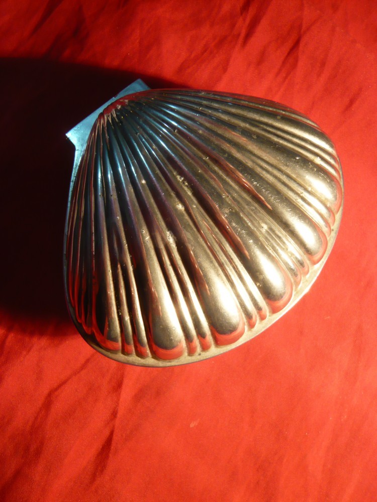 Caseta veche in forma de Scoica - metal argintat , dim.=11,5x 9,7x 9,5 cm