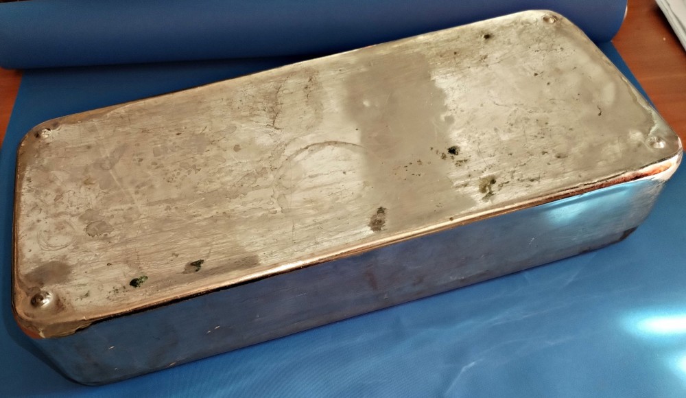 Casoleta inox vintage sterilizare depozitare transport instrumentar medical greutate 2 kg 43cm/19cm/8 cm capac prevazut cu manere stare conform foto