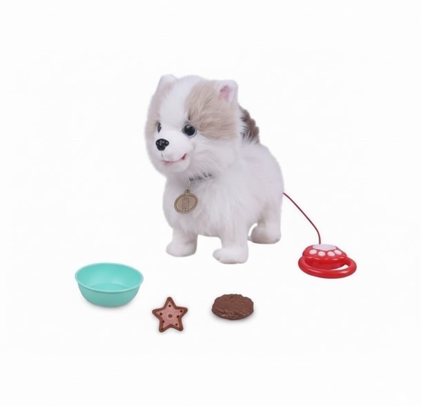 Setul include: catelusul, 2 biscuiti de jucarie, bol pentru catelus.