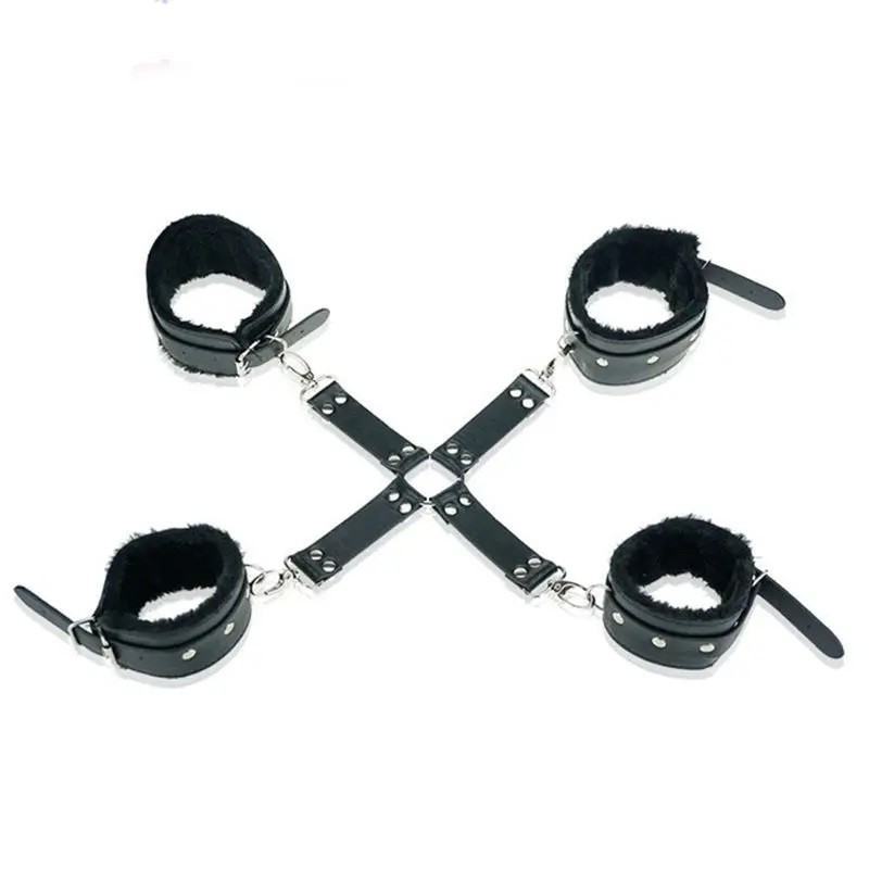 Set bondage format din catuse pentru maini, catuse pentru glezne si sistem de curele in forma de X, pentru a imobiliza partenerul.Cureaua dispune de carabine, iar catusele sunt prevazute cu inele metalice si sistem reglabil de inchidere pe baza de catarame.Pentru a spori confortul in timpul utilizarii, catusele sunt captusite cu blanita artificiala.Alte specificatii: material poliuretan + poliester | Material: Poliuretan | Culoare: Negru