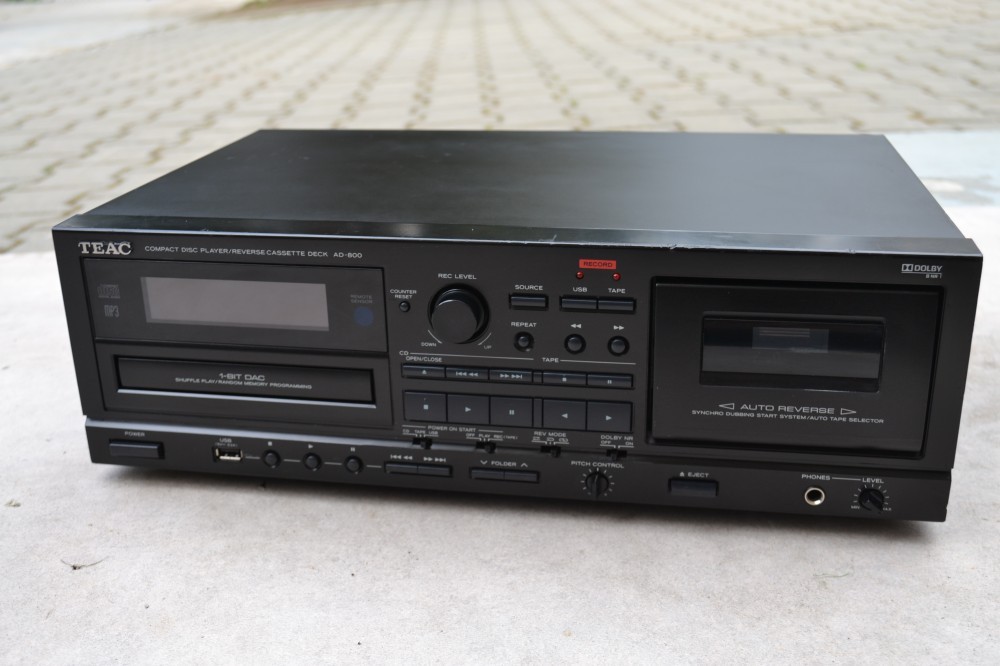 Cd Player Tascam Reverse Cassette Deck AD 800 : culoare neagra, mufa casti, Mp 3, senzor telecomanda, afisaj, port USB, deck cu autoreverse, recording level, poze reale.