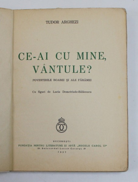 CE-AI CU MINE VANTULE de TUDOR ARGHEZI , POVESTIRILE BOABEI SI ALE FARAMEI CU FIGURI de LUCIA DEMETRIADE BALACESCU , 1937