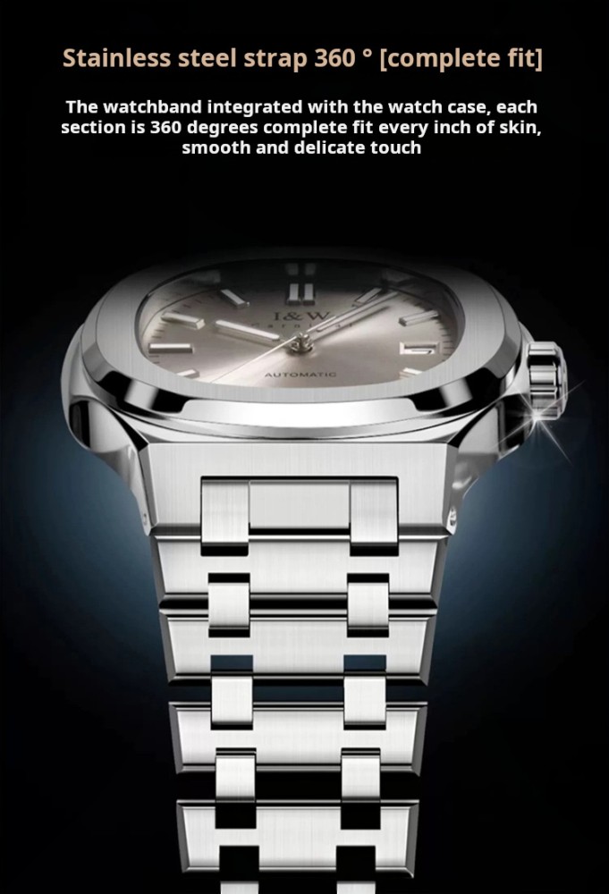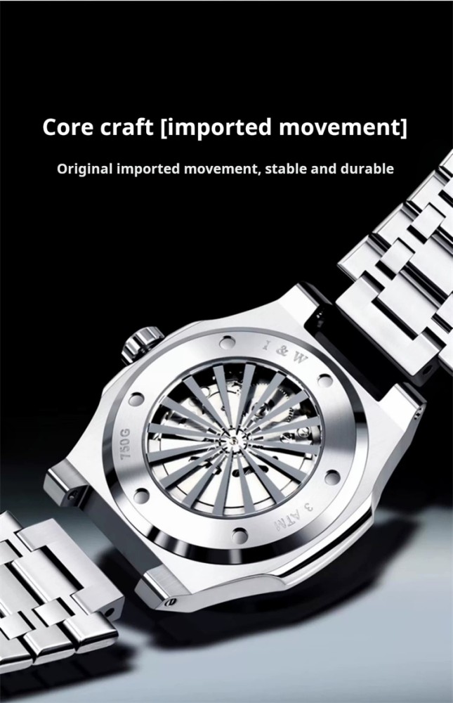 Realizat din oțel inoxidabil de înaltă calitate, acest model impresionează prin carcasa sa pătrată și finisajele luxoase. Sticla de safir cristal asigură rezistență sporită la zgârieturi, iar mecanismul automatic self-wind garantează precizie și fiabilitate.