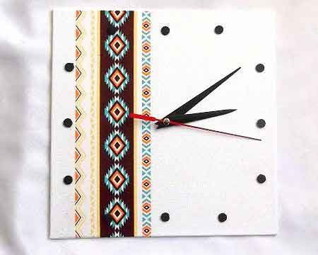 Ceas cu elemente traditional romanesti, ceas lemn pentru perete 32036. Produs decoratiune pentru casa si gradina. Are ca design elemente traditionale romanesti – modele geometrice pe un fundal alb. Culori: blue / albastru deschis, maro, portocaliu si galben. Ceas de perete realizat cu tehnica servetelului si lacuit cu lac ecologic pe baza de apa. Dimensiuni: 20 cm / 20 cm.