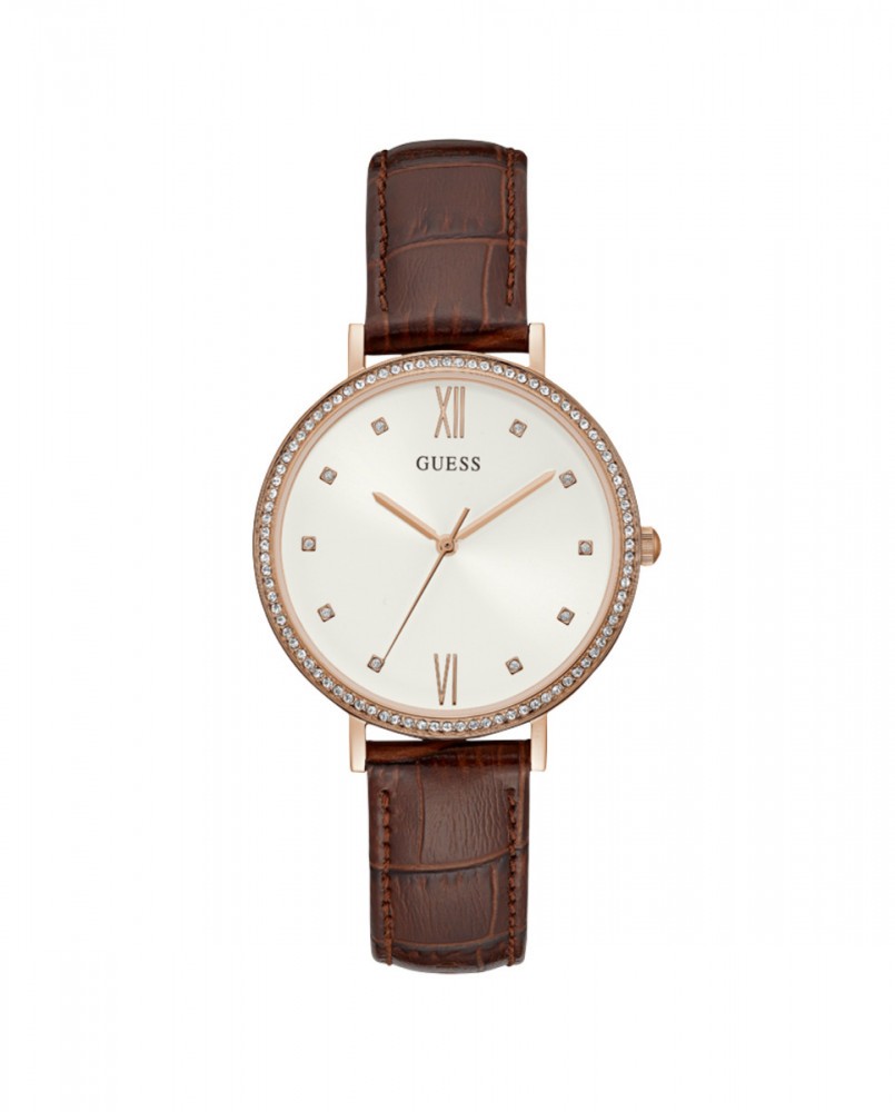 Ceasul de mana Guess pentru femei are mecanism quartz si este potrivit stilului elegant. Carcasa este din inox si are diametrul de 38 mm iar cureaua este confectionata din piele naturala. Cadranul are display analog si geamul foarte rezistent realizat din cristal mineral cu etanseitate (rezistenta la apa) de 3 atm.
