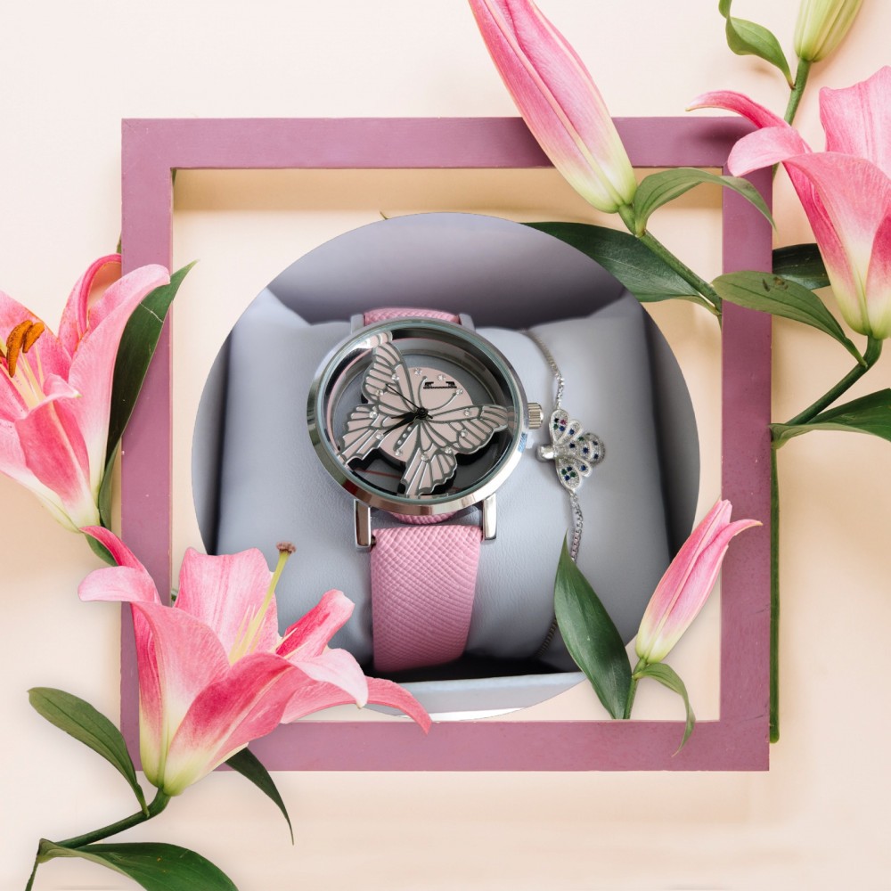 Culoare ceas argintiu cu detaliu fluture cu pietre