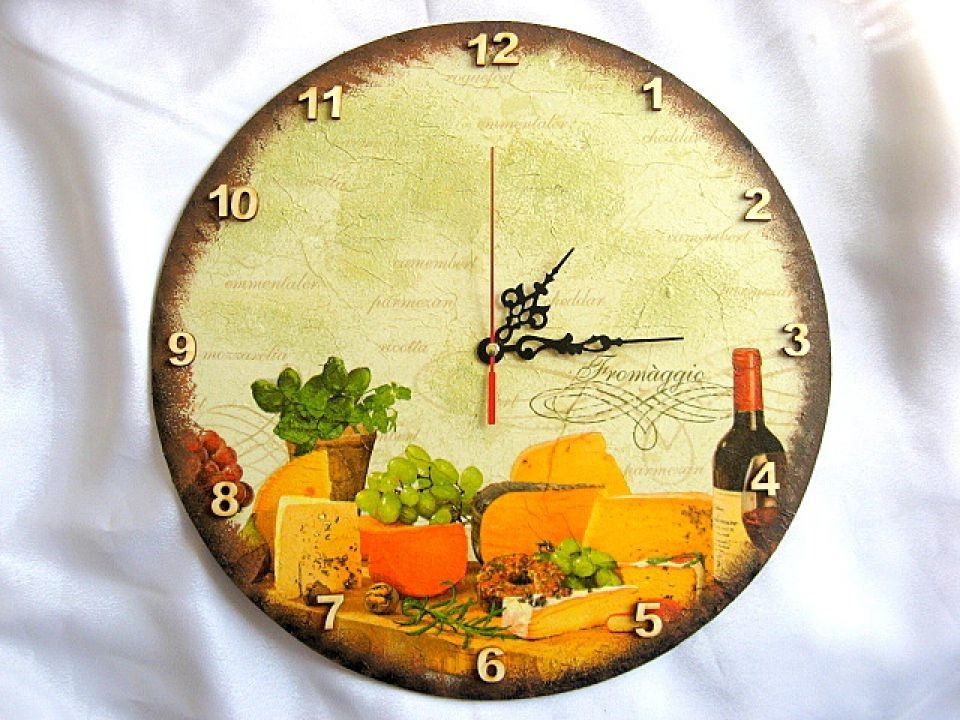 ceas de perete realizat pe lemn cu tehnica servetelului si
